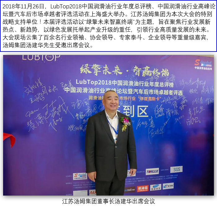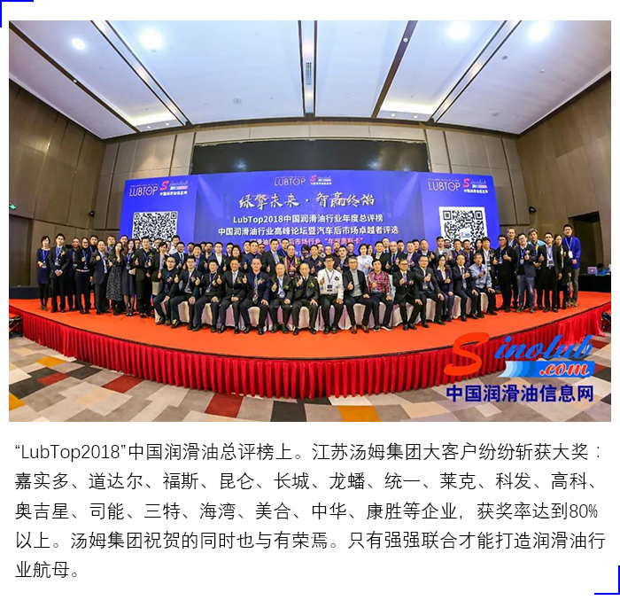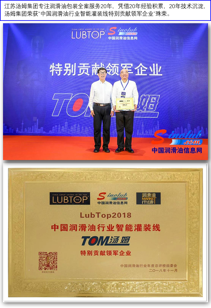 湯姆集團榮獲"LubTop2018中國潤滑油行業智能灌裝線特別貢獻領軍企業"稱號